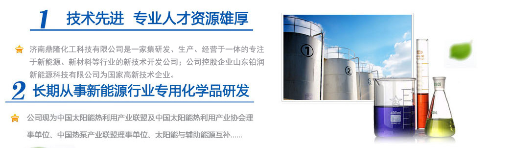 濟(jì)南鼎隆化工科技有限公司是一家集研發(fā)、生產(chǎn)、經(jīng)營(yíng)于一體的專注于新能源、新材料等行業(yè)的新技術(shù)開發(fā)公司;公司控股企業(yè)山東鉑潤(rùn)新能源科技有限公司為國(guó)家高新技術(shù)企業(yè)。擁有雄厚的科研實(shí)力和專業(yè)銷售隊(duì)伍以及多名從事化學(xué)化工專業(yè)的高素質(zhì)人員,其中博士生導(dǎo)師1人,碩士研究生3人。公司現(xiàn)為中國(guó)太陽(yáng)能熱利用產(chǎn)業(yè)聯(lián)盟及中國(guó)太陽(yáng)能熱利用產(chǎn)業(yè)協(xié)會(huì)理事單位、中國(guó)熱泵產(chǎn)業(yè)聯(lián)盟理事單位、山東清潔能源供暖產(chǎn)業(yè)聯(lián)盟理事單位、太陽(yáng)能與輔助能源互補(bǔ)供熱/制冷工程專業(yè)委員會(huì)會(huì)員單位。公司專注于綠色科技,專業(yè)化研發(fā)環(huán)境友好型化工產(chǎn)品,與眾多高校和國(guó)內(nèi)外多家著名化學(xué)品公司保持戰(zhàn)略合作關(guān)系。公司擁有“載能”和“澤能”...更多